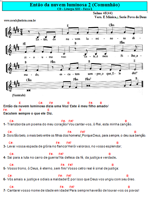 Baixe as partituras das músicas para serem tocadas no 10º domingo do Tempo Comum. O Canal da Música disponibiliza aos ministérios de música uma sugestão de repertório com canções que podem ser tocadas na Santa Missa do domingo, 5 de junho, além da possibilidade de baixarem as partituras.Liturgia do domingo - 05/06/2016.: Sugestão de melodia do Salmo 29